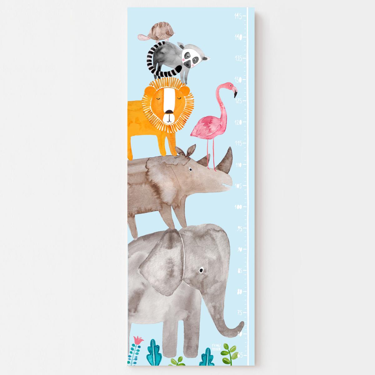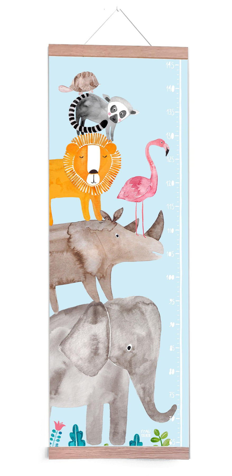 Hoch hinauf mit Elefant, Nashorn, Löwe, und Schildkröte. All die Wildtiere begleiten dein Kind beim Wachsen auf dieser Messlatte für das Kinderzimmer und begeistern Jungen und Mädchen gleichermaßen.
