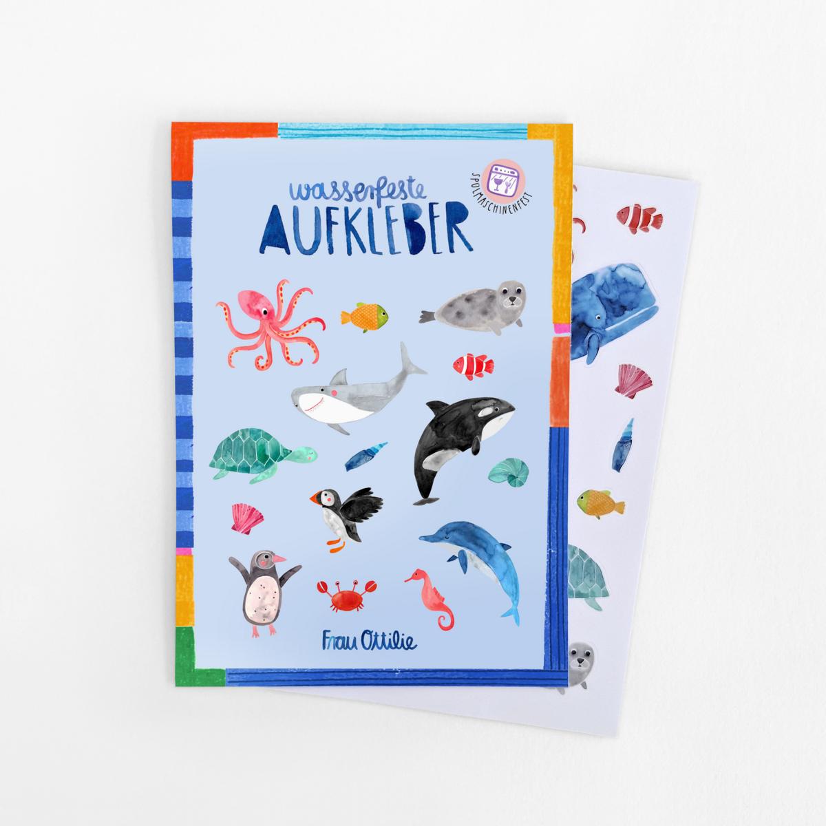 Unsere wasser- und spülmaschinenfesten Aufkleber *Wildes Meer* für Mädchen und Jungen wurden für alle Unterwasser Fans illustriert. Wal, Delphin, Hai, Oktopus, Schildkröte, Robbe oder Clownfisch - diese bunte Schar umfasst die beliebtesten Meerestiere.